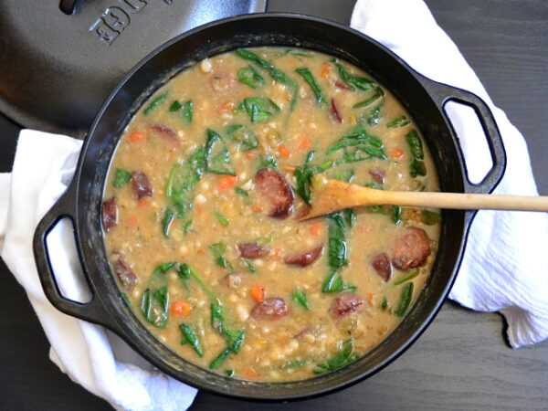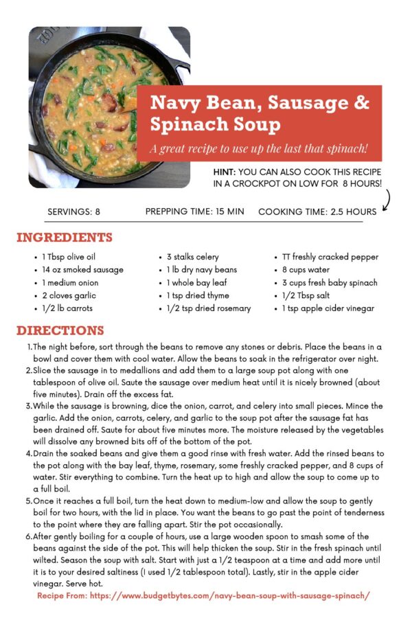 Soups are a great way to use up those leafy greens before they go bad! This hearty navy bean soup made with dry beans, sausage, spinach, and other veggies, from Budget Bites, is a yummy and filling meal in one bowl!